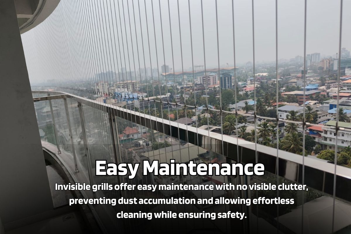 Even with their transparent design, invisible grilles offer a robust and secure barrier. They are built to withstand significant force, ensuring they effectively prevent unauthorized access and provide safety to guard against falls from elevated areas.