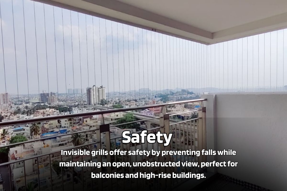 Invisible grilles are an advanced safety system designed to protect your family, especially children 🚸, without obstructing your view. They effectively prevent birds from entering and spoiling your balcony while also ensuring that objects do not fall off balconies or windows. Made from SS.316 marine-grade wire with a 2mm diameter, 7×7 construction, and nano-coated nylon technology, these grilles are 100% rust-free and highly durable. The 2-inch wire gap (premium size) provides optimal safety without compromising aesthetics. They feature weatherproof aluminum powder-coated sections for strong foundation support, along with high-quality stainless steel fasteners, screws, and durable hardware. Backed by a 10-year warranty (excluding physical damage), invisible grilles offer long-lasting protection. Book your visit today and ensure a safe and secure home! 🦺🚸🧒